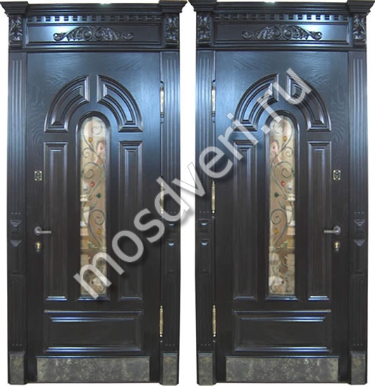 Элитная парадная дверь из черного массив дуба со стеклом, ковкой и резьбой по дереву — объединяет эстетичность и максимальную защиту.
