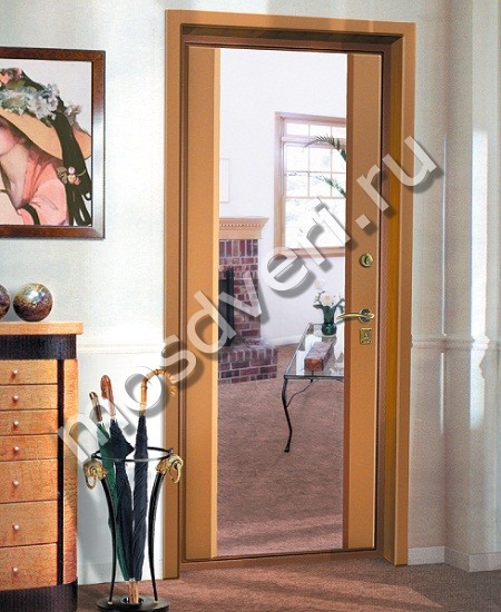 Зеркало вмонтировано с внутренней стороны в панель таким образом, что при повреждении его можно заменить, не снимая створок с петель. Наружная панель представляет собой стальной лист, окрашенный эмалью, или по порошковой технологии, покрытой ламинатом, шпоном, экокожей, или другим отделочным материалом. В дверь встроен глазок, который установлен рядом с зеркалом.