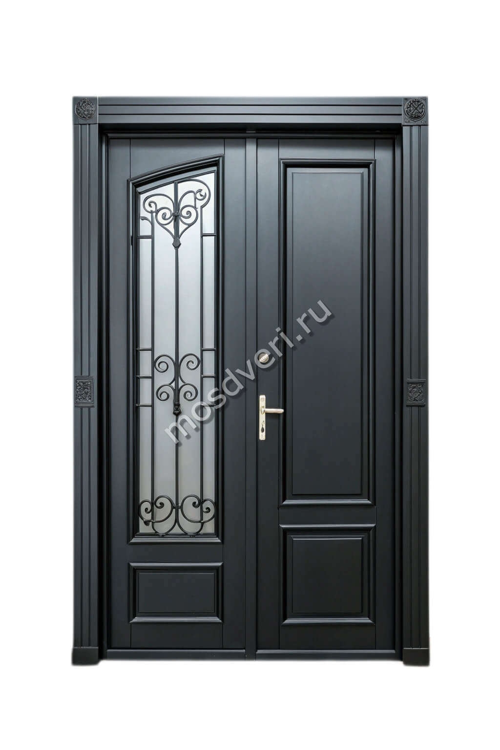 Двустворчатая красивая входная дверь со стеклянной вставкой КДД-019 — совмещает современный дизайн и превосходные защитные характеристики.